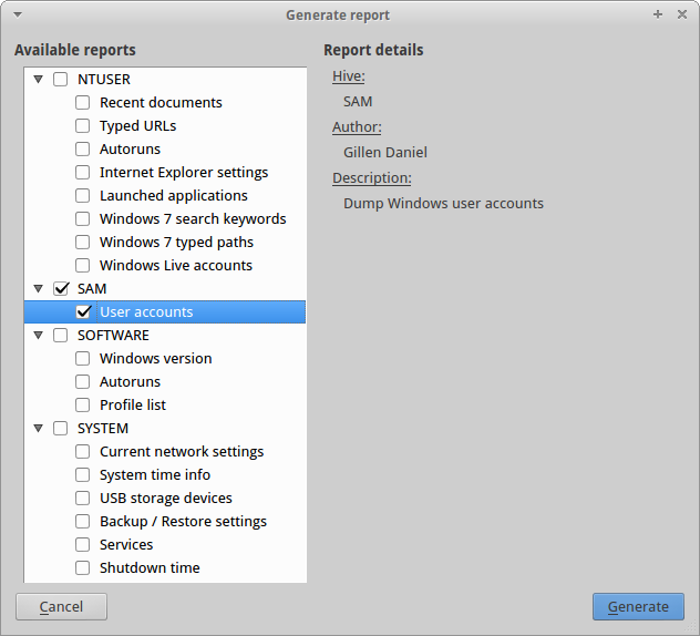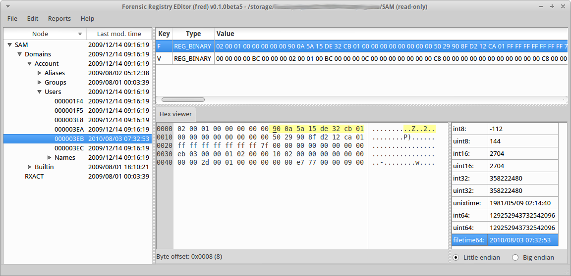 Forensic Registry EDitor (fred) is a cross-platform M$ registry hive editor. This project was born out of the need for a reasonably good registry hive viewer for Linux to conduct forensic analysis. Therefore it includes some functions not found in normal "free" registry editors like a hex viewer with data interpreter and a reporting function that can easily be extended with custom ECMAScript report templates.
